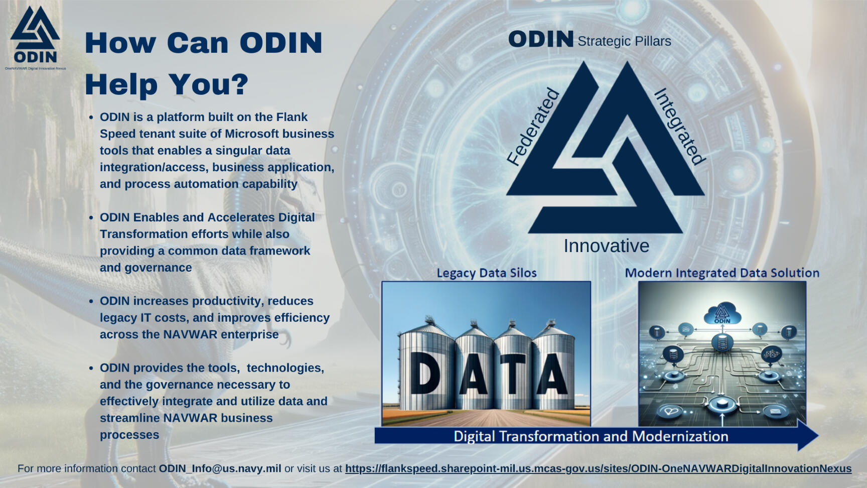 Naval Warfare Information Systems Command (NAVWAR) is driving data-informed decision making and digital transformation with the creation of the OneNAVWAR Digital Innovation Nexus (ODIN).